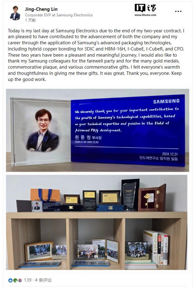 IT之家属目到开yun体育网,Jing-Cheng Lin 已在领英上证据了其从三星辞职的音书,并暗意其为期两年的合合并经到期。他还强调了我方在三星期间为先进封装时期作念出的孝敬,包括用于 3D IC 的混杂铜键合时期以及 HBM-16H 的研发。